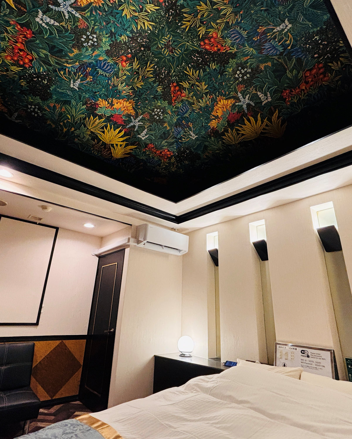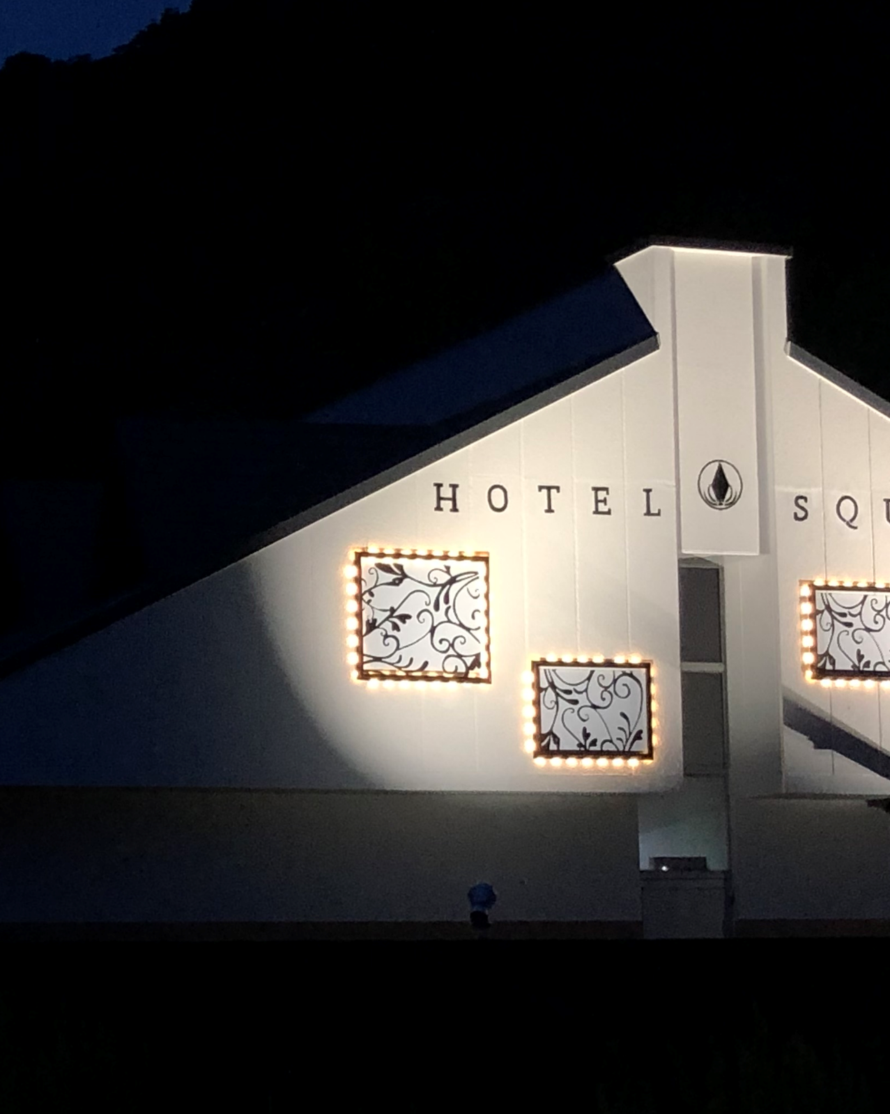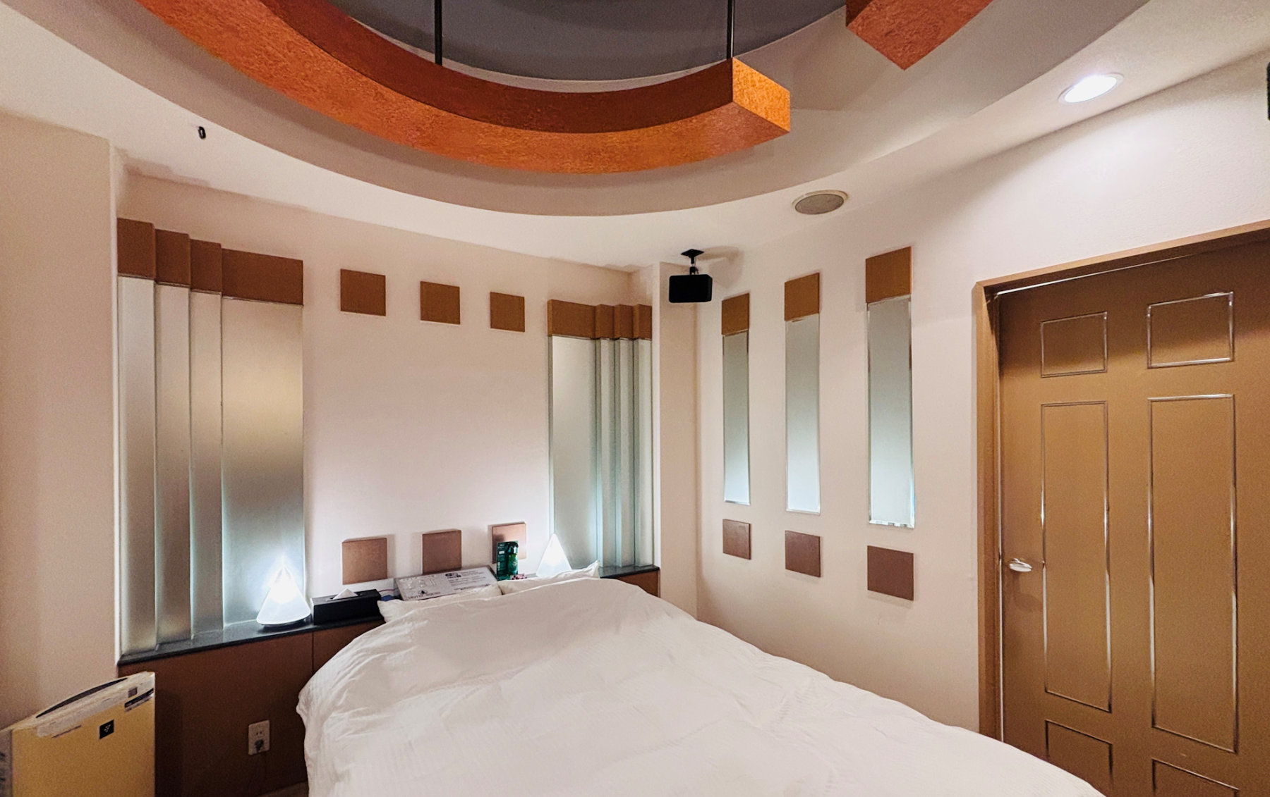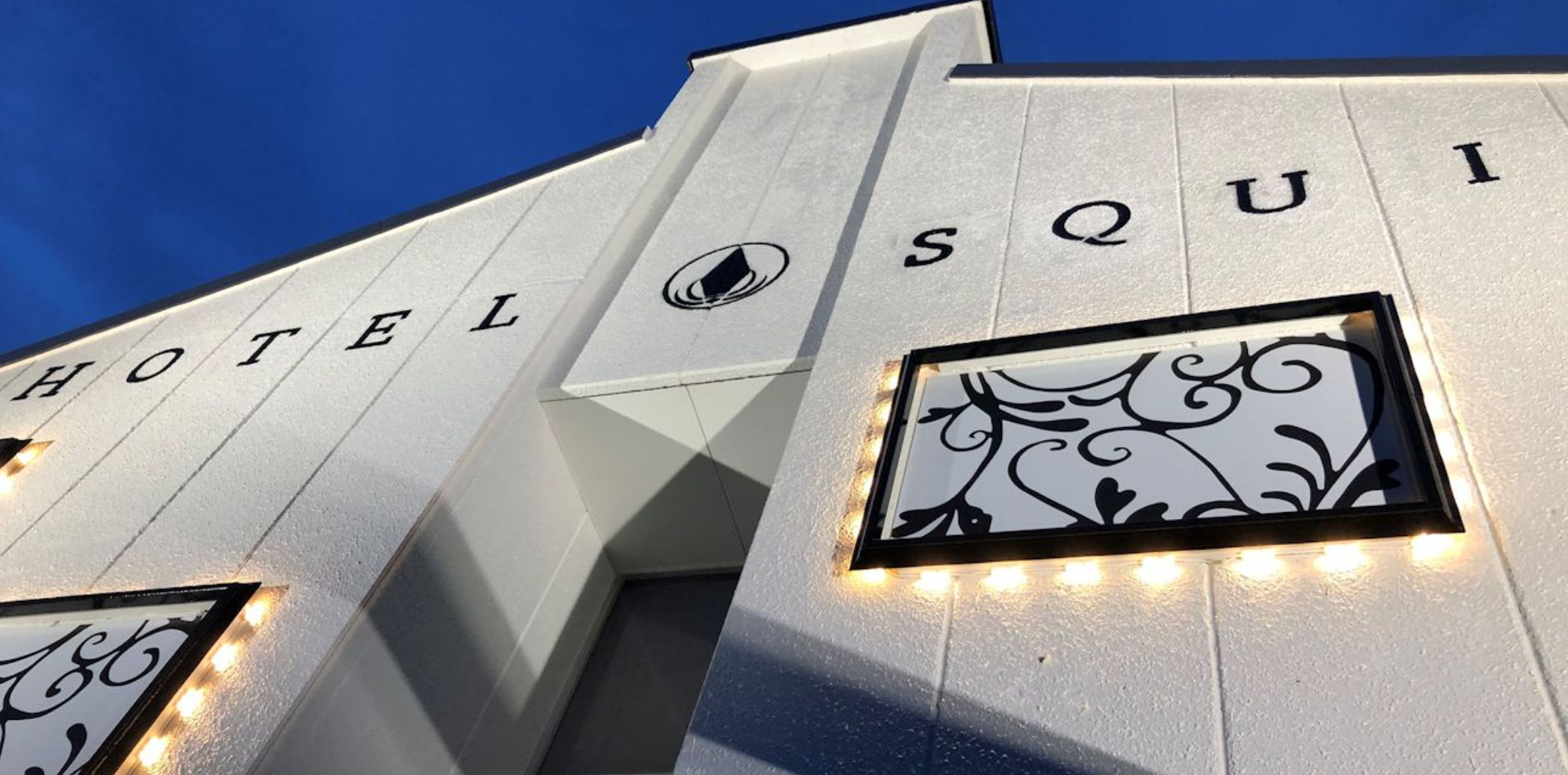 自然に囲まれた場所に、白い三角形が目印のワンガレージタイプのホテルです。